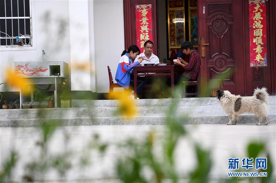 6月19日,在金寨縣三合實(shí)驗(yàn)學(xué)校,蔡齊艷和同學(xué)一起吃午飯。新華社記者張端攝