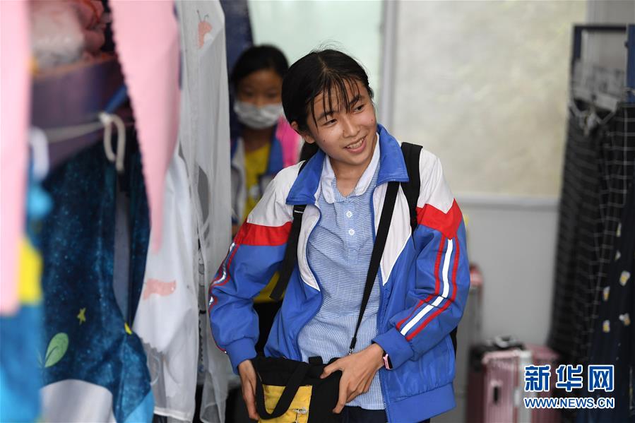 6月19日,在金寨縣三合實(shí)驗(yàn)學(xué)校宿舍,蔡齊艷放學(xué)后收拾行李準(zhǔn)備回家過周末。新華社記者劉軍喜攝