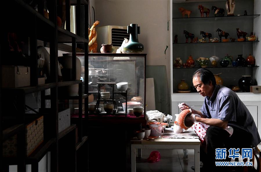 在河南省鞏義市站街鎮(zhèn)小黃冶村的工作室里,游光明運(yùn)用點(diǎn)彩手法施釉(6月19日攝)。新華社記者李安攝