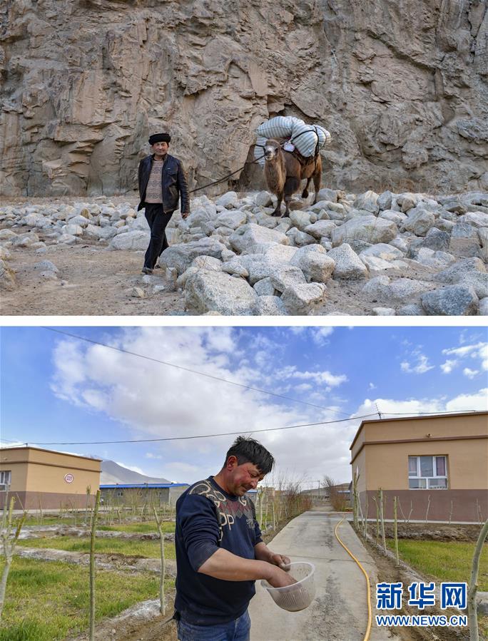 拼版照片:上圖為新疆塔什庫爾干塔吉克自治縣大同鄉(xiāng)村民都熱·加爾曼牽著馱有搬遷行李的駱駝,走在山谷中(2018年11月17日攝);下圖為都熱·加爾曼在易地扶貧搬遷安置點準備播撒草籽(6月3日攝)。新華社記者胡虎虎攝