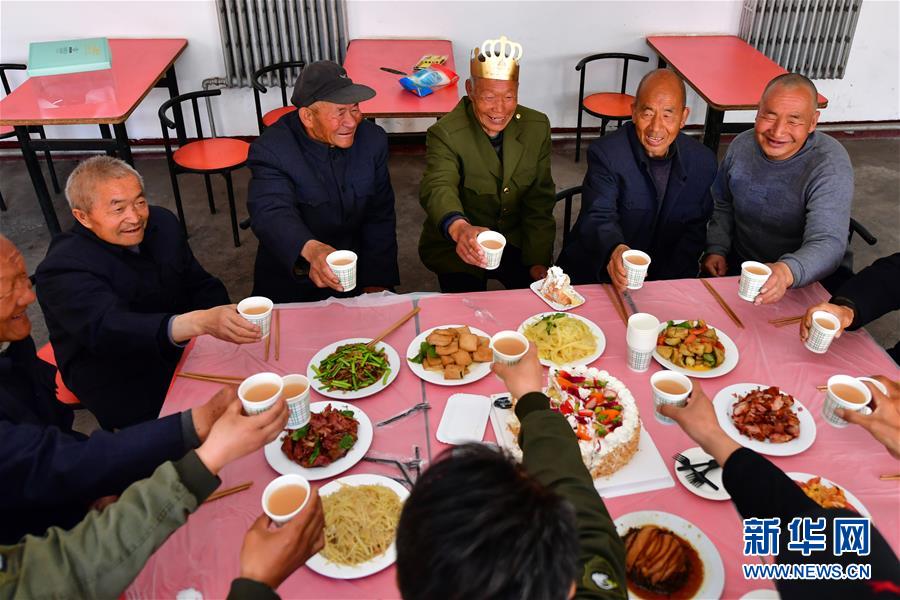 山西省壺關(guān)縣石坡鄉(xiāng)雙井村的“五保戶”李松興(右三)在石坡鄉(xiāng)養(yǎng)老院過生日(4月22日攝)。新華社記者曹陽攝