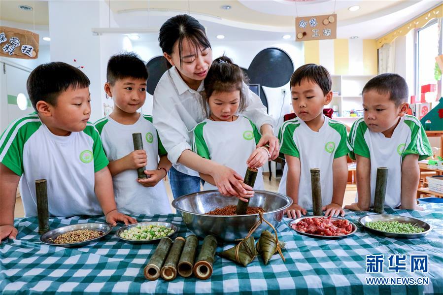 6月23日,長(zhǎng)興縣李家巷鎮(zhèn)中心幼兒園的孩子們?cè)诶蠋煹膸ьI(lǐng)下,一起學(xué)習(xí)制作端午粽子和竹筒飯。為了迎接即將到來的端午節(jié),浙江省湖州市長(zhǎng)興縣各個(gè)幼兒園開展“品民俗迎端午”主題活動(dòng),讓小朋友們體驗(yàn)傳統(tǒng)民俗文化。新華社記者徐昱攝