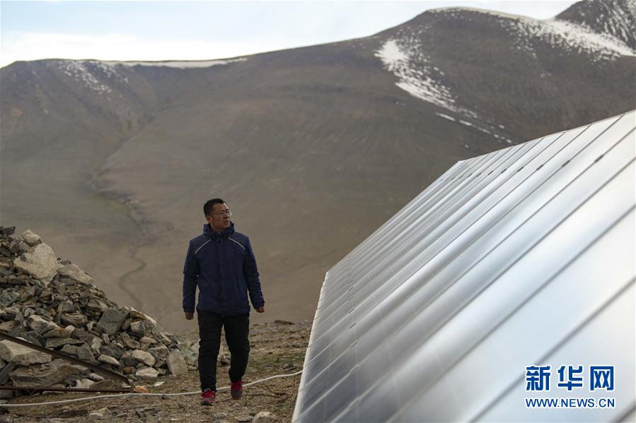 在中國科學院新疆天文臺慕士塔格觀測站,馮國杰檢查太陽能光伏電板的運行情況(6月15日攝)。新華社記者胡虎虎攝