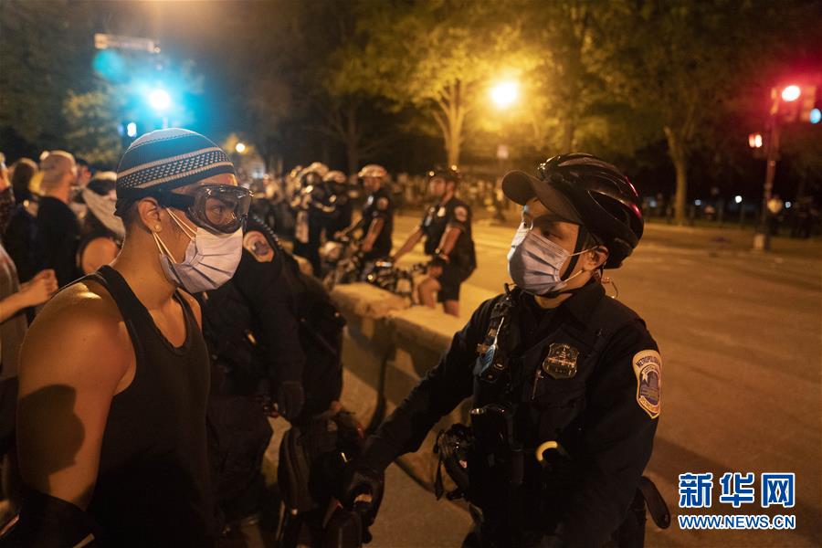 6月22日,警察和示威者在美國華盛頓白宮附近對峙。美國警察和示威者22日晚在首都華盛頓市白宮北側(cè)拉斐特廣場發(fā)生沖突并對峙。美國總統(tǒng)特朗普在社交媒體上說,許多人因破壞廣場上美國前總統(tǒng)安德魯·杰克遜的雕像及附近圣約翰圣公會教堂被逮捕。新華社記者劉杰攝