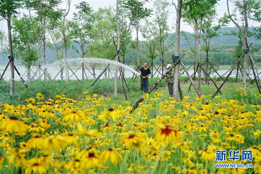 6月27日,園林工人在遷西縣長(zhǎng)河帶狀公園給綠地澆水。新華社記者牟宇攝