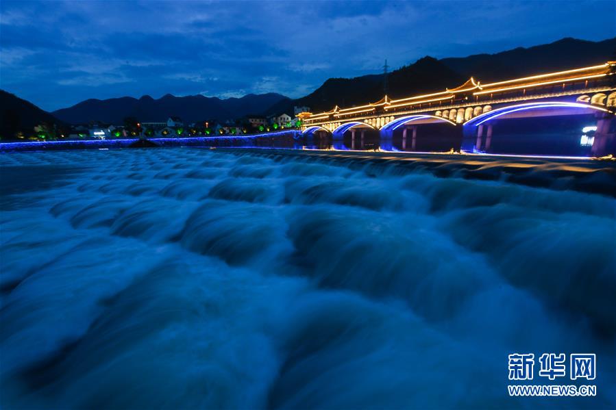 6月27日拍攝的夜色中的杭州市富陽區(qū)湖源鄉(xiāng)龍鱗壩。近期,浙江省杭州市富陽區(qū)場口鎮(zhèn)、常安鎮(zhèn)和湖源鄉(xiāng)組團開啟了一場夏季“綠水青山嘉年華”。這幾個壺源溪流域鄉(xiāng)鎮(zhèn)整合生態(tài)旅游資源,組團開發(fā)山村旅游項目,游客可以參與壺源溪水上游樂、露營永安山頂、特色農產品集市和瓜果節(jié)等特色活動。新華社記者徐昱攝
