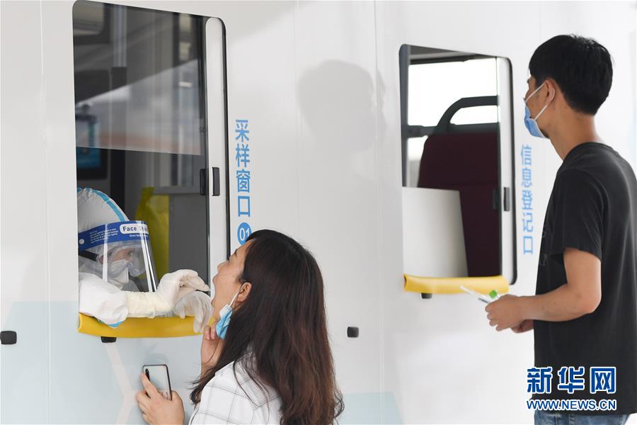 6月28日,在北京市西城區(qū)北京展覽館南側(cè)的露天廣場核酸檢測采樣點(diǎn),核酸檢測采樣車內(nèi)的醫(yī)護(hù)人員為前來做檢測的人員進(jìn)行采樣。新華社記者鞠煥宗攝