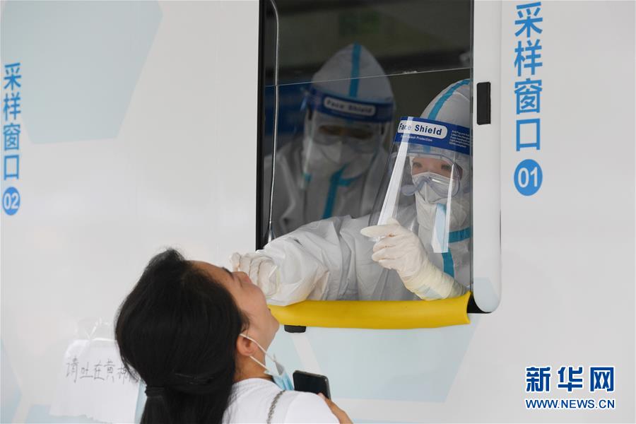 6月28日,在北京市西城區(qū)北京展覽館南側(cè)的露天廣場核酸檢測采樣點(diǎn),核酸檢測采樣車內(nèi)的醫(yī)護(hù)人員為前來做檢測的人員進(jìn)行采樣。新華社記者鞠煥宗攝