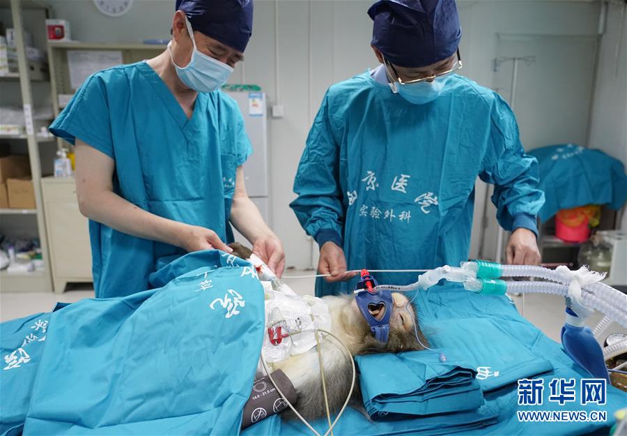 6月29日,研究人員在病房?jī)?nèi)查看移植肝受體猴。日前,多基因編輯豬-恒河猴異種肝、心、腎器官移植在位于陜西西安的空軍軍醫(yī)大學(xué)西京醫(yī)院順利實(shí)施。研究團(tuán)隊(duì)使用豬內(nèi)源性逆轉(zhuǎn)錄病毒(PERV)敲除的13個(gè)基因修飾豬作為供體,將一個(gè)供體豬的肝、心、腎分別移植給3只恒河猴受體。目前,移植肝和對(duì)應(yīng)的受體猴已存活16天,突破國(guó)際上的豬-猴輔助性肝移植最長(zhǎng)存活時(shí)間記錄。這項(xiàng)研究有助于未來解決器官短缺造成的臨床器官移植發(fā)展受限難題。新華社記者邵瑞攝
