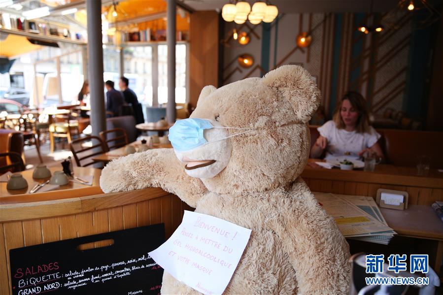 6月18日,在法國巴黎一家餐館內(nèi),一只毛絨玩具熊被戴上口罩,胸前掛著“歡迎光臨,請(qǐng)使用消毒洗手液并佩戴口罩”的牌子。新華社記者高靜攝