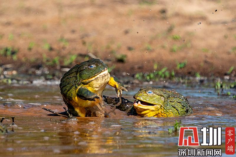 2020年6月30日?qǐng)?bào)道(具體拍攝時(shí)間不詳),南非波羅克瓦克,兩只雄性非洲牛蛙為了爭(zhēng)奪雌性牛蛙,在池塘中打架,這樣的情形十分罕見(jiàn)。畫(huà)面中,戰(zhàn)況十分激烈,一只非洲牛蛙在另外一只試圖逃到池塘邊緣時(shí)撕咬對(duì)手,甚至將另外一只拋向空中。這些精彩的照片是由南非開(kāi)普敦?cái)z影師Temujin Johnson拍攝的。