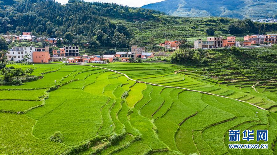 貴州省盤州市新民鎮(zhèn)的梯田風(fēng)光(6月29日攝,無人機(jī)照片)。夏日時節(jié),貴州省盤州市新民鎮(zhèn)的梯田風(fēng)景如畫。新華社記者陶亮攝
