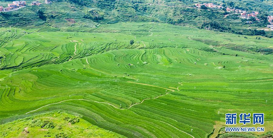 貴州省盤州市新民鎮(zhèn)的梯田風光(6月29日攝,無人機照片)。夏日時節(jié),貴州省盤州市新民鎮(zhèn)的梯田風景如畫。新華社記者陶亮攝