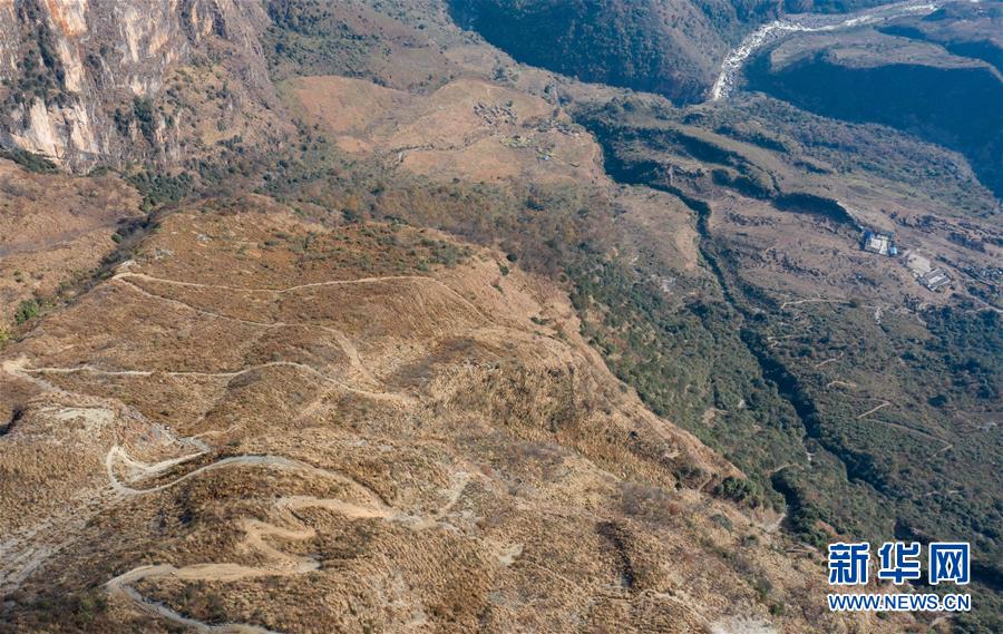 俯瞰通往阿布洛哈村的羊腸小道(2019年12月27日攝,無人機(jī)照片)。新華社記者江宏景攝