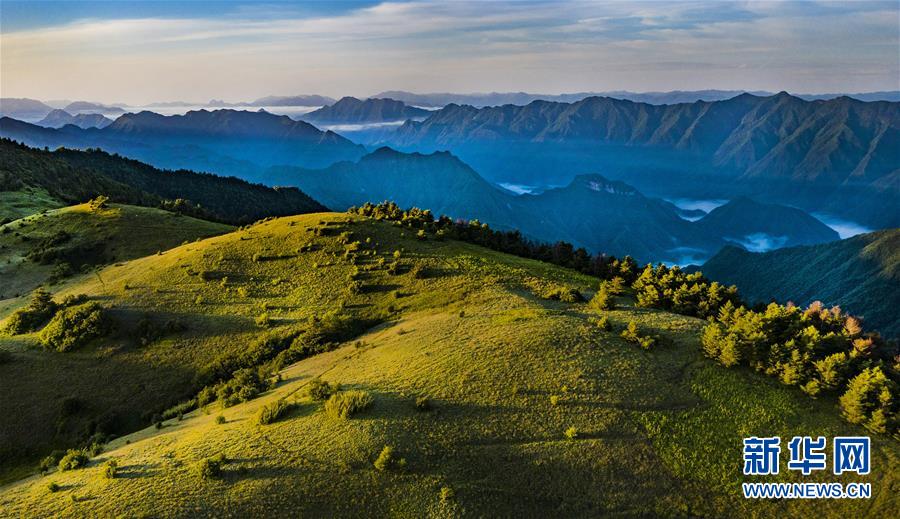 6月30日,朝霞照耀下的神田草甸(無人機(jī)照片)。位于陜西省安康市嵐皋縣與重慶市城口縣交界處大巴山神田主脊北坡的神田草甸,面積超過1.1萬(wàn)畝。夏日的朝霞中,起伏的草甸仿佛一塊寬大無邊的綠色地毯,鑲嵌在大巴山上,如詩(shī)如畫。新華社記者陶明攝