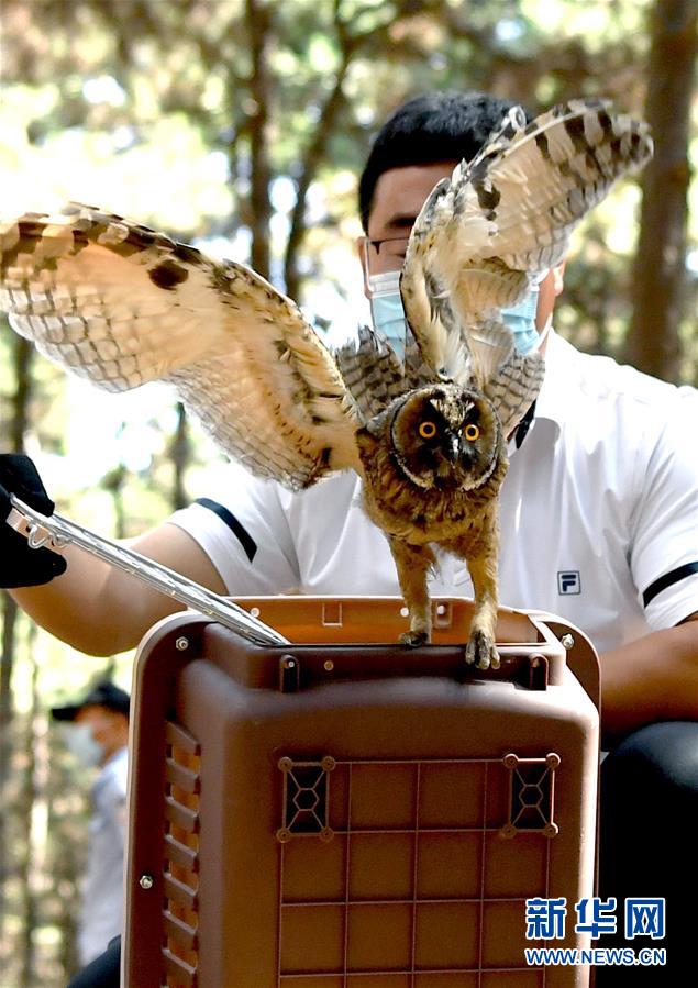 7月1日,吉林省野生動物救護繁育中心工作人員放飛一只長耳鸮。當日,吉林省東北虎園舉行放飛活動,吉林省野生動物救護繁育中心救護的40只珍稀野生鳥類成功放歸自然。新華社記者林宏攝