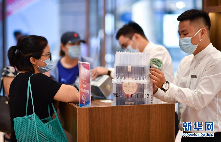 7月1日,??谌赵聫V場免稅店的工作人員為顧客打包酒類商品。當(dāng)日,海南開始實(shí)施調(diào)整后的離島免稅購物政策。海南離島旅客每年每人免稅購物額度提高至10萬元,電子消費(fèi)產(chǎn)品等7類新增商品開售。新華社記者郭程攝