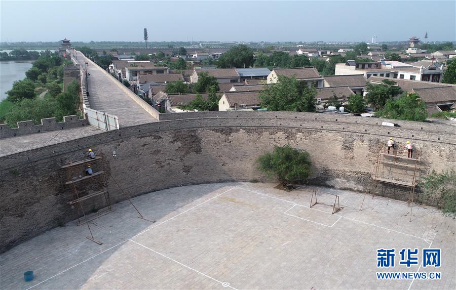 7月2日,工作人員在永年廣府古城修繕城墻(無人機照片)。經(jīng)國家文物局和河北省文物局批準,河北永年廣府古城修繕工程已全面啟動。在文物專家全程參與下,按照“不改變文物原狀”原則進行修繕,預計2021年4月底完工。永年廣府古城擁有華北地區(qū)保存最完整的古城墻,現(xiàn)為全國重點文物保護單位。新華社記者王曉攝