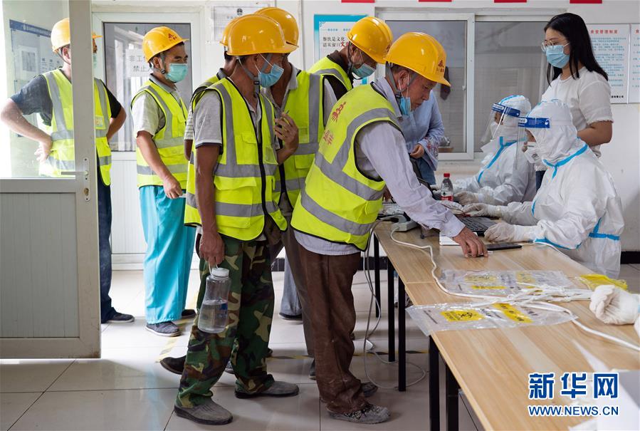 7月2日,在北京市大興區(qū)中建三局二公司北京公司一項(xiàng)目建筑工地的臨時核酸檢測采樣點(diǎn),醫(yī)護(hù)人員為建筑工地人員采集咽拭子。新華社記者才揚(yáng)攝