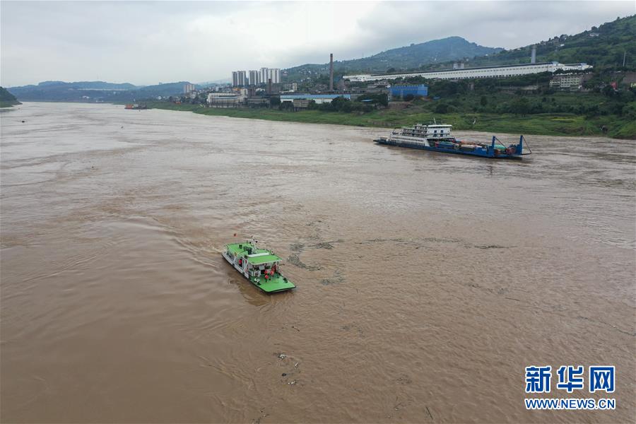 7月2日,長江清溪場水文站的水文作業(yè)船(左)在長江上進行水文測量作業(yè)(無人機照片)。新華社記者劉潺攝