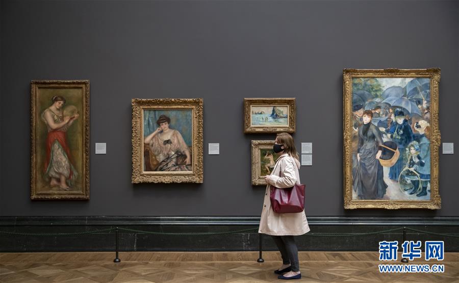 7月4日,參觀者佩戴口罩在英國(guó)國(guó)家美術(shù)館的媒體開(kāi)放日上參觀。受新冠疫情影響而關(guān)閉的英國(guó)國(guó)家美術(shù)館將于7月8日重新對(duì)公眾開(kāi)放,成為倫敦首批開(kāi)門(mén)迎客的博物館、美術(shù)館。參觀者需提前網(wǎng)上預(yù)約參觀時(shí)段,全程佩戴口罩且保持安全距離。新華社記者韓巖攝