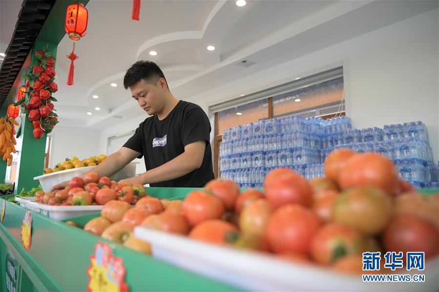 7月5日,在黑龍江省肇東市昌五鎮(zhèn)昌盛村農(nóng)業(yè)生態(tài)觀光園農(nóng)產(chǎn)品展銷區(qū),工作人員在整理果蔬。黑龍江省肇東市昌五鎮(zhèn)昌盛村農(nóng)業(yè)生態(tài)觀光園占地千余畝,融合了種植采摘、民俗產(chǎn)品展銷、旅游觀光等項目,方便周邊農(nóng)民就近就業(yè),助力脫貧增收。新華社記者王建威攝