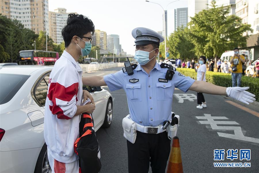 7月7日,在位于北京的中國人民大學附屬中學考點外,北京市公安局公安交通管理局海淀交通支隊中關(guān)村大隊交警付云輝在指揮車輛有序行駛。當日,2020年高考拉開帷幕。新華社記者沈伯韓攝