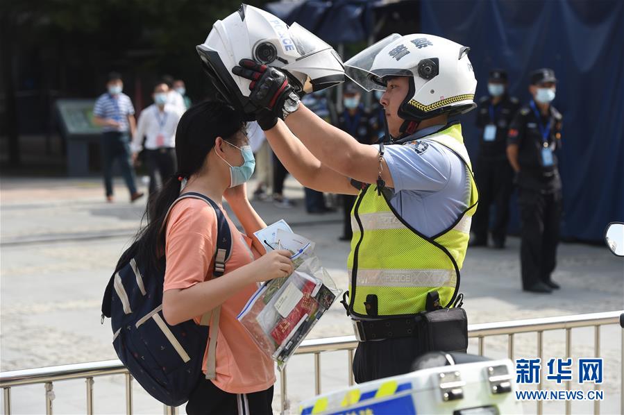 7月7日,在安徽省合肥市五十中學天鵝湖校區(qū)考點,交警將快要遲到的考生送到考場。當日,2020年高考拉開帷幕。新華社記者周牧攝