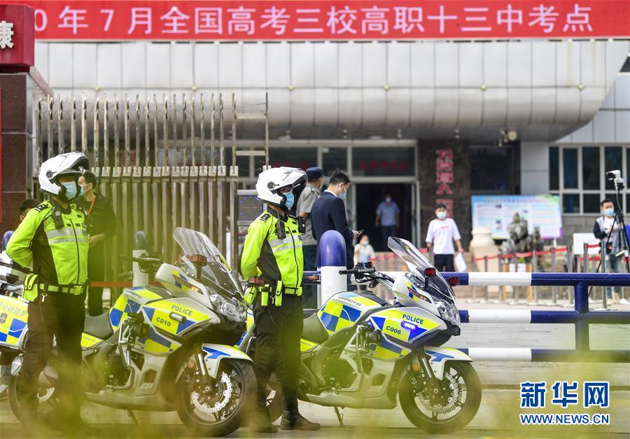 7月7日,在烏魯木齊市第十三中學考點外,烏魯木齊市公安局交通警察支隊特勤大隊昆侖鐵騎騎警孟凡超(右)與梁劍在執(zhí)勤。當日,2020年高考拉開帷幕。新華社記者王菲攝