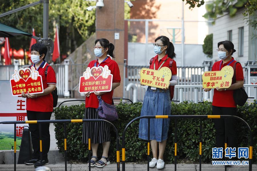 7月7日,在位于北京的中國人民大學(xué)附屬中學(xué)考點(diǎn)外,前來送考的老師舉著提示牌送考生進(jìn)考場。當(dāng)日,2020年高考拉開帷幕。新華社記者沈伯韓攝