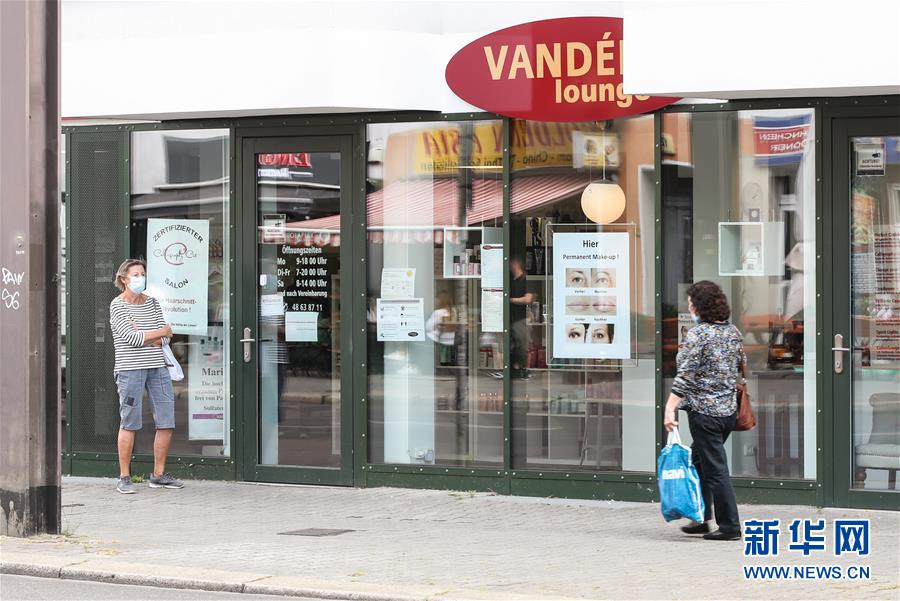 7月7日,一名佩戴口罩的女子(左)等待進入德國首都柏林的一家理發(fā)店。針對有地方官員呼吁取消民眾乘坐公交車和在商場購物時須戴口罩的規(guī)定,德國聯(lián)邦政府6日表示,支持延續(xù)“口罩強制令”。4月底,德國全部16個聯(lián)邦州陸續(xù)出臺“口罩強制令”,即居民在乘坐公交車和購物時須佩戴口罩。新華社記者單宇琦攝
