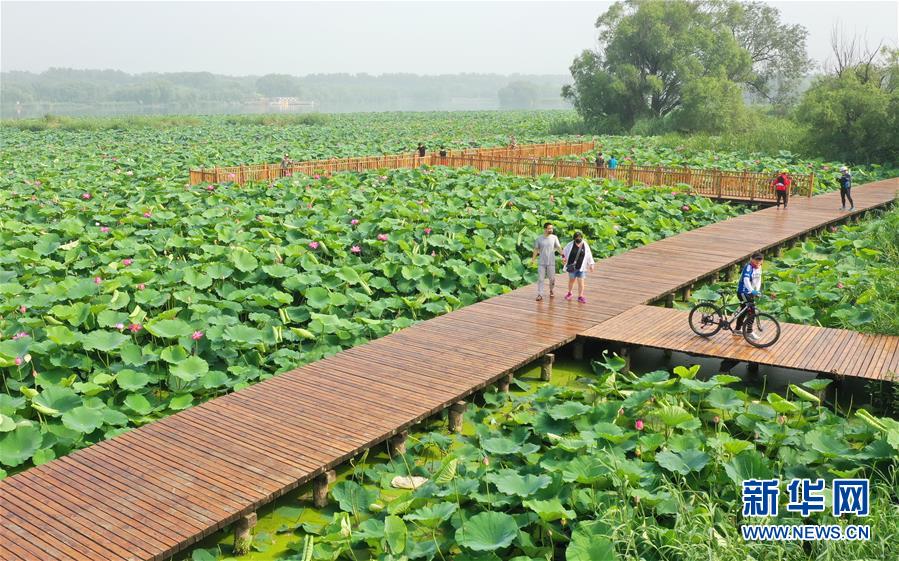 7月7日,游客在唐山市南湖公園欣賞盛開的荷花(無人機(jī)照片)。近日,河北省唐山市南湖公園內(nèi)荷花競(jìng)相綻放,呈現(xiàn)出“接天蓮葉無窮碧,映日荷花別樣紅”的美麗景象,吸引了眾多游客前來觀賞。新華社記者楊世堯攝