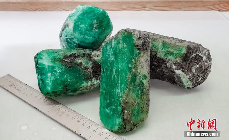 當?shù)貢r間7月7日,俄羅斯斯維爾德洛夫斯克州,俄羅斯國家技術(shù)集團在馬林斯克礦區(qū)內(nèi)發(fā)現(xiàn)總重量達4.8公斤的4塊綠寶石,是最近20年來發(fā)現(xiàn)的同類品質(zhì)中最大的寶石。圖片來源:視覺中國