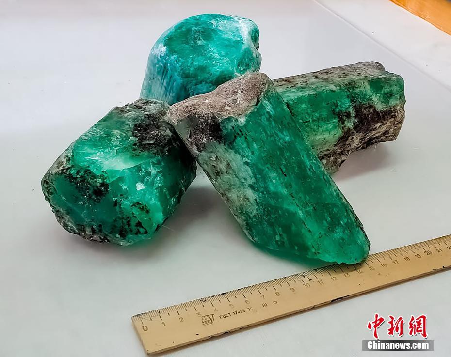 當(dāng)?shù)貢r(shí)間7月7日,俄羅斯斯維爾德洛夫斯克州,俄羅斯國(guó)家技術(shù)集團(tuán)在馬林斯克礦區(qū)內(nèi)發(fā)現(xiàn)總重量達(dá)4.8公斤的4塊綠寶石,是最近20年來(lái)發(fā)現(xiàn)的同類品質(zhì)中最大的寶石。圖片來(lái)源:視覺(jué)中國(guó)