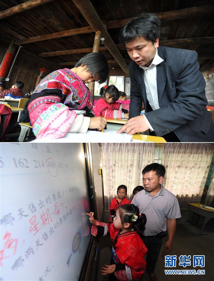 這是一張拼版照片,上圖:在廣西龍勝龍脊鎮(zhèn)江柳村翁江小學(xué),余啟貴老師輔導(dǎo)學(xué)生做課堂作業(yè)(2013年2月26日攝);下圖:在廣西龍勝龍脊鎮(zhèn)江柳村翁江小學(xué),余啟貴老師輔導(dǎo)學(xué)生做課堂作業(yè)(7月7日攝)。新華社記者陸波岸攝