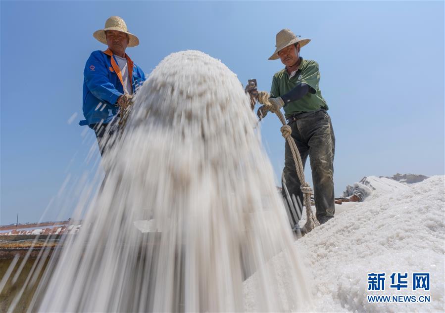 7月9日,唐山市曹妃甸區(qū)南堡鹽場(chǎng)的工人將收獲的春鹽裝船。在我國(guó)長(zhǎng)蘆鹽區(qū)海鹽生產(chǎn)基地之一的河北省唐山市曹妃甸區(qū)南堡鹽場(chǎng),一年一度的春鹽收獲工作即將結(jié)束,今年南堡鹽場(chǎng)的春鹽產(chǎn)量預(yù)計(jì)可達(dá)72萬(wàn)噸。新華社記者楊世堯攝