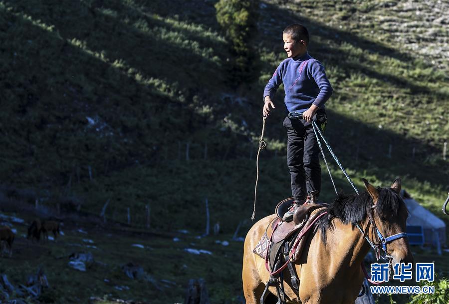 在新疆特克斯縣境內(nèi)的夏牧場(chǎng)里,一名小朋友站在馬背上玩耍(6月30日攝)。新華社記者王菲攝
