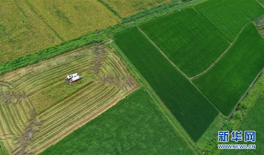 7月11日,在湖南省衡陽市衡陽縣臺源鎮(zhèn)臺九村,村民駕駛收割機(jī)收割早稻(無人機(jī)照片)。近日,湖南各地農(nóng)村陸續(xù)進(jìn)入“雙搶”季,農(nóng)民緊抓農(nóng)時,搶收搶種,力爭糧食穩(wěn)產(chǎn)豐收。新華社記者趙眾志攝