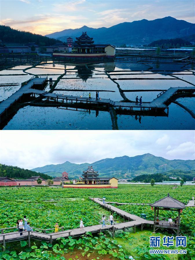 拼版照片:人們?cè)谄衷创艴庺~溪公園內(nèi)游覽(上圖為4月17日拍攝;下圖為7月3日拍攝)。新華社記者 姜克紅 攝