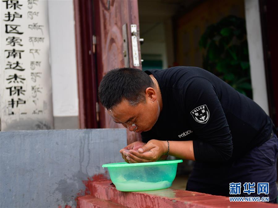 在可可西里索南達(dá)杰保護(hù)站,龍周才加在洗漱(6月30日攝)。新華社記者 張龍 攝