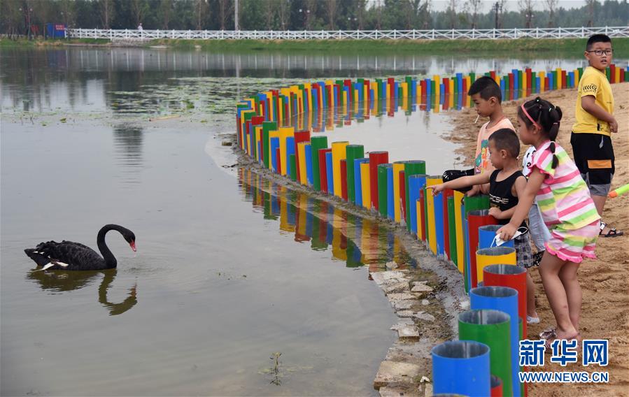 7月14日,小朋友在汶上縣白石鎮(zhèn)北泉村民俗旅游區(qū)玩耍。近年來(lái),山東省汶上縣在鄉(xiāng)村振興過(guò)程中整治鄉(xiāng)村環(huán)境、發(fā)展生態(tài)產(chǎn)業(yè),建設(shè)美麗宜居的綠色鄉(xiāng)村。新華社記者 王凱 攝