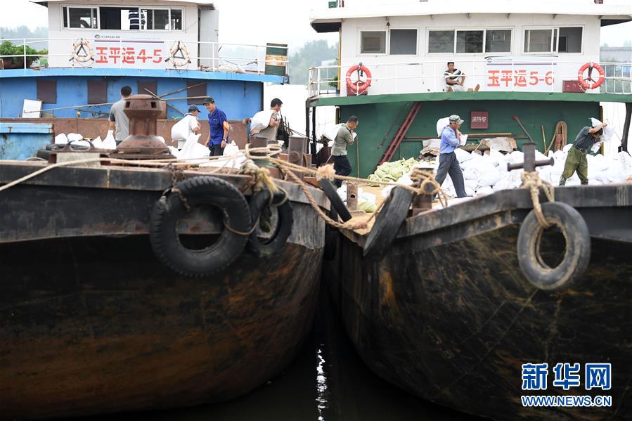 7月14日,當(dāng)?shù)卮迕裢簧习徇\(yùn)砂石袋。近日,受洪水影響,安徽省望江縣華陽鎮(zhèn)境內(nèi)的江調(diào)圩內(nèi)部道路漫水,搶險車輛無法進(jìn)入。當(dāng)?shù)胤姥床块T組織船只裝載砂石袋等防汛物資,運(yùn)往圩堤保防汛。新華社記者 劉軍喜 攝