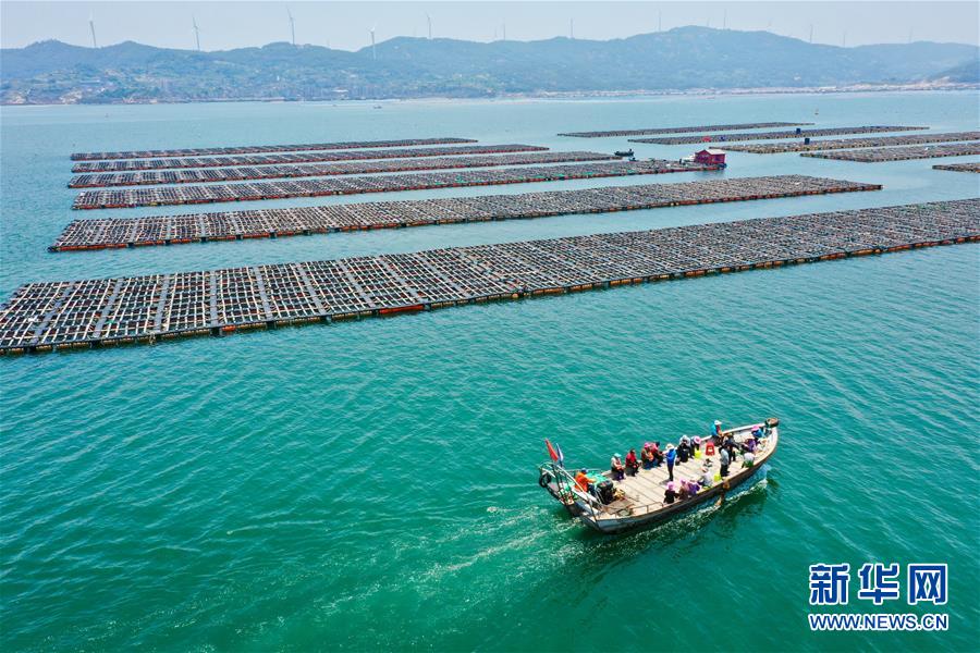 7月14日,漁船行駛在福建省連江縣新型漁排鮑魚養(yǎng)殖區(qū)域(無人機照片)。新華社記者 姜克紅 攝