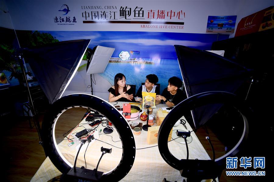 7月14日,在福建省連江縣鮑魚(yú)產(chǎn)品直播中心,工作人員在網(wǎng)上直播銷(xiāo)售鮑魚(yú)產(chǎn)品。新華社記者 姜克紅 攝