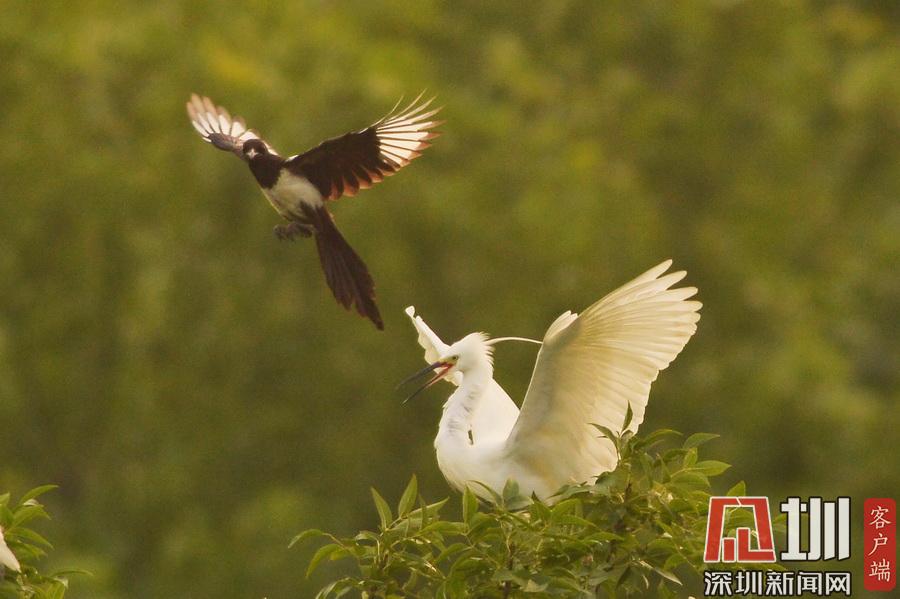 2020年7月14日,在山東省青島市城陽區(qū)紅島街道一處林間,晚歸的白鷺與喜鵲在枝頭“蹁躚起舞”,優(yōu)美如畫。