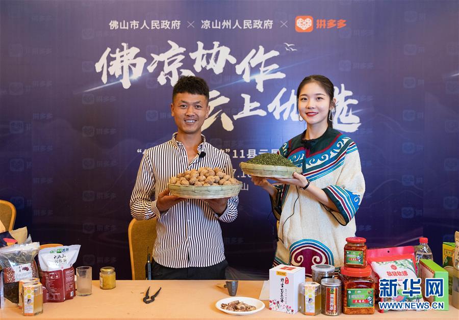 7月18日,在涼山州昭覺(jué)縣粵川東西部扶貧協(xié)作項(xiàng)目產(chǎn)業(yè)園,昭覺(jué)縣縣長(zhǎng)赫紹洪(右)在直播活動(dòng)中向網(wǎng)友推薦農(nóng)特產(chǎn)品。新華社記者江宏景攝