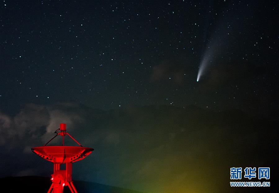 7月18日晚,在明安圖觀測(cè)基地,尼歐懷茲彗星劃過(guò)天際。7月18日晚至19日凌晨,在位于內(nèi)蒙古錫林郭勒盟正鑲白旗境內(nèi)的國(guó)家天文臺(tái)明安圖觀測(cè)基地,尼歐懷茲彗星劃過(guò)天際。在明安圖觀測(cè)基地內(nèi),排列著100面白色的拋物面天線。這個(gè)龐大的天線陣列便是草原“天眼”——明安圖射電頻譜日像儀。草原“天眼”持續(xù)接收太陽(yáng)射電輻射,然后由科研人員進(jìn)行數(shù)據(jù)分析研究,對(duì)空間環(huán)境監(jiān)測(cè)、太陽(yáng)活動(dòng)預(yù)報(bào)均有重要作用。新華社記者連振攝