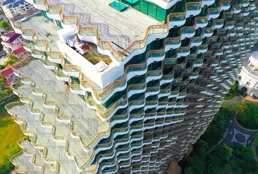 2020年7月20日,海南省三亞市,圖為航拍的“九棵大樹(shù)”建筑群。建筑物陽(yáng)臺(tái)均為波浪形,視野良好,契合三亞“海”的屬性。