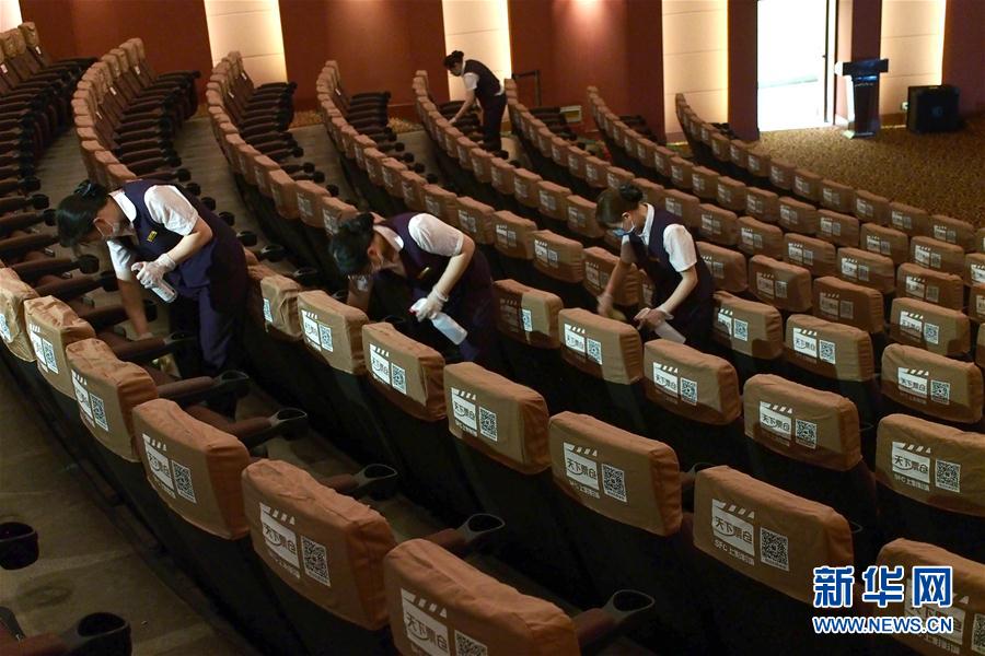 2020年7月19日,上海影城員工在放映廳里為座位消毒。當(dāng)日,上海部分電影院為恢復(fù)開(kāi)放營(yíng)業(yè)進(jìn)行最后階段準(zhǔn)備。新華社記者任瓏攝
