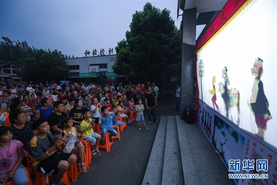 7月21日,和睦橋村的村民們在文化禮堂觀看皮影戲表演。新華社記者徐昱攝